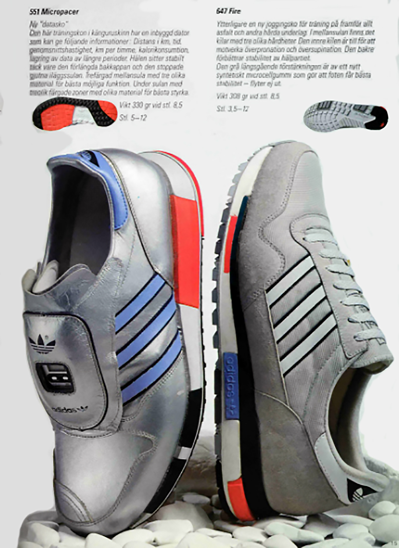 1984年のアディダスのカタログに掲載されたマイクロペーサーです。右がファイアーになり約20gほどマイクロペーサーが重くなっているのが判ります。