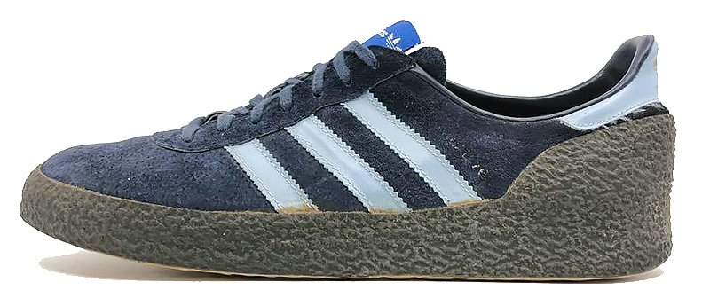 1976年モデルのモントリオール76、西ドイツ製です。こちらは踵のヒールカウンターが大きく、当時は非常に不人気なシューズでした。このため結構残っていることが多く、モントリオールの中では見つけやすいシューズとなっています。最初のモデルは紺に水色のラインのみ発売されました。後半になるとベロにトレフォイルマークが付くようになります。