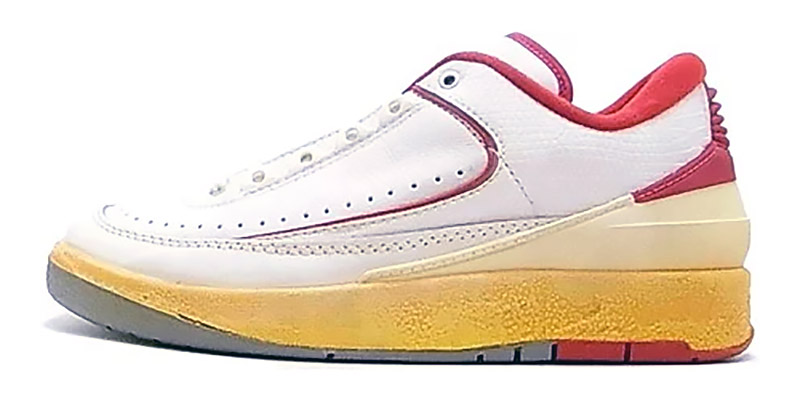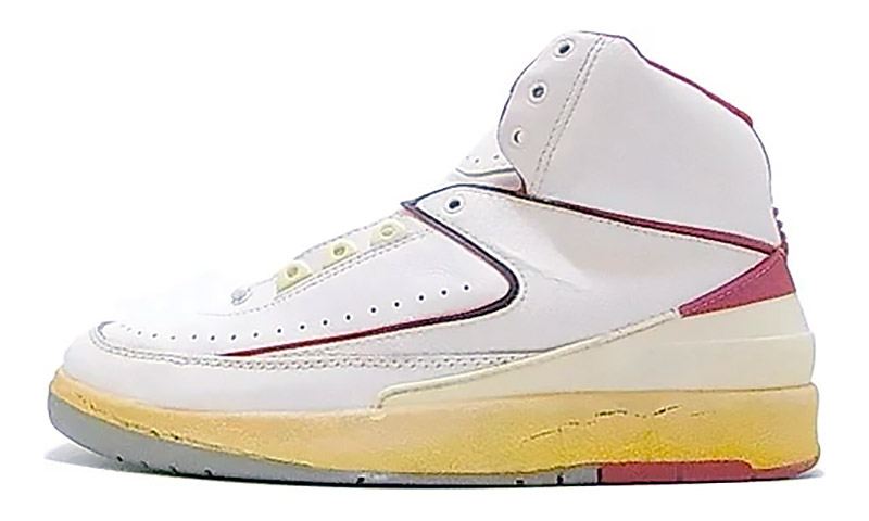 品番4361の白/赤のジョーダンⅡです。ソールはPUで出来ていますので、現在では加水分解してほとんど履くことはできないでしょう。このセカンドモデル以降ミッドソールがポリウレタンで出来ていますので、ほぼすべてのオリジナルは観賞用でしか存在しません。外側をコーティングしても内部から加水分解していきますので、履いたらソールが剥がれることは間違いないです。