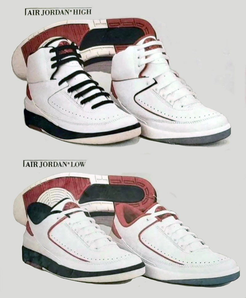 エアジョーダンⅡのサンプル・ハイカットモデルとしてはご覧の黒と赤の2タイプが存在しています。アンクル部分はジョーダン1を継承していることが伺えますが、ジョーダンマークの表記はNIKEになっています。スウッシュが付いていないためNIKEらしくないシューズになっています。